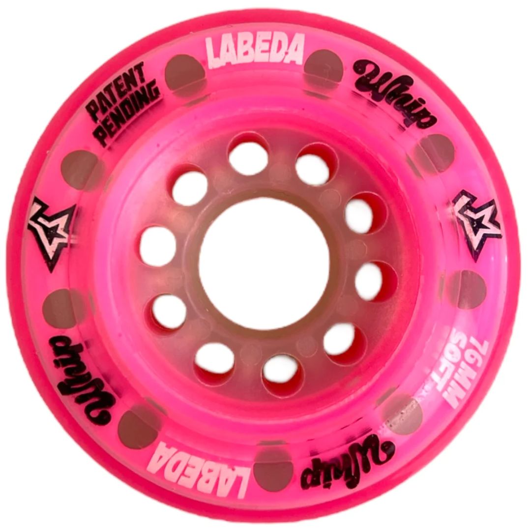 - The Pink Labeda Whip is the first real true innovation in wheels since the inception of dual and triple pour wheels. In testing and R&D for over 8 years. It’s unique “Patent Pending” EVO core creates a snap back effect that launches you out of every cut and step on the rink. Your wheels have never instantly reacted to your every move, until now.
