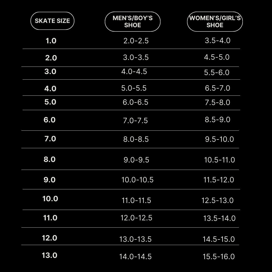 - Order 1-1.5 sizes below US shoe size to get skate size